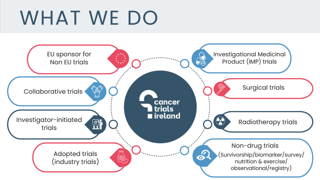 We are the leading cancer research trials organisation in Ireland. We work closely with local investigators, international collaborative groups such as EORTC, BIG, ANZUP and NRG and global pharmaceutical companies. Find out more about our existing partnerships here.